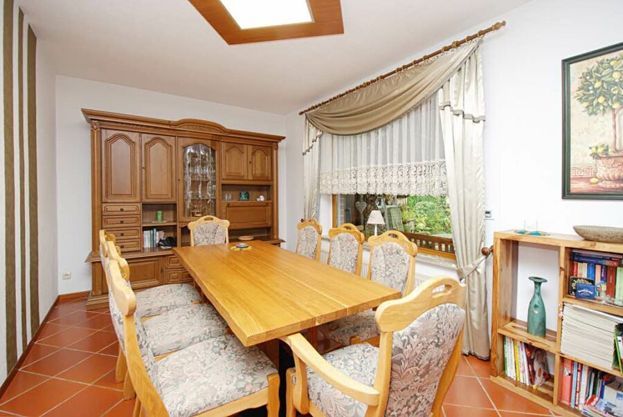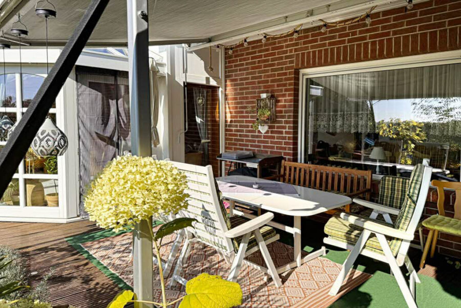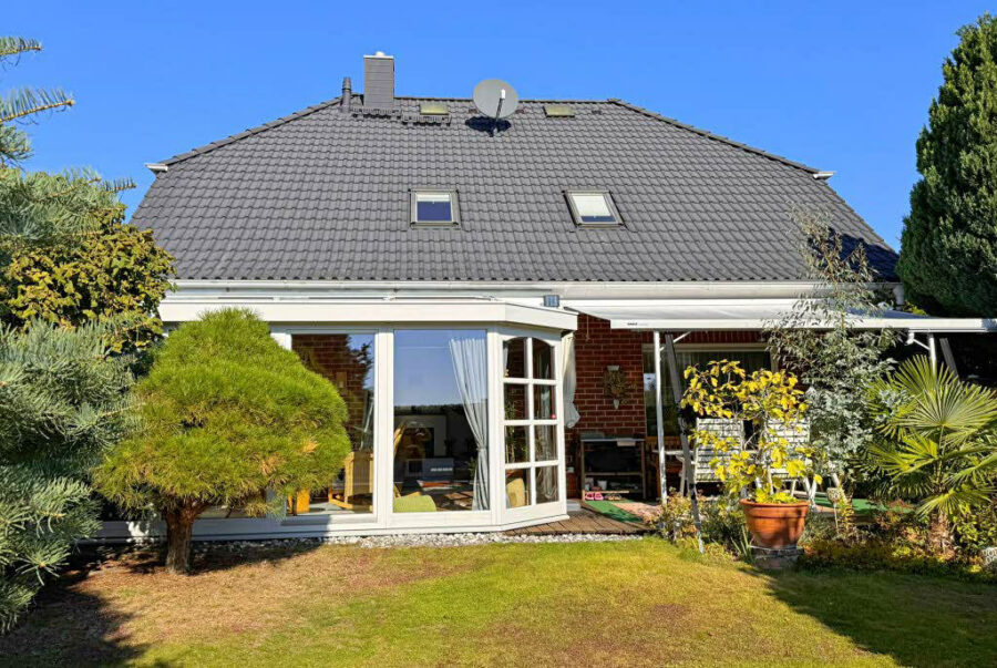 Auf ca. 146 qm Wohnfläche befinden sich 5 Zimmer, eine Küche mit Einbauküche, ein Vollbad und ein Duschbad. An den offenen Wohnbereich mit großem Kamin schließt sich ein schöner Wintergarten mit Blick in den Erholungsgarten an. Neben dem Wintergarten befindet sich eine Terrasse mit Sonnen-Markise.