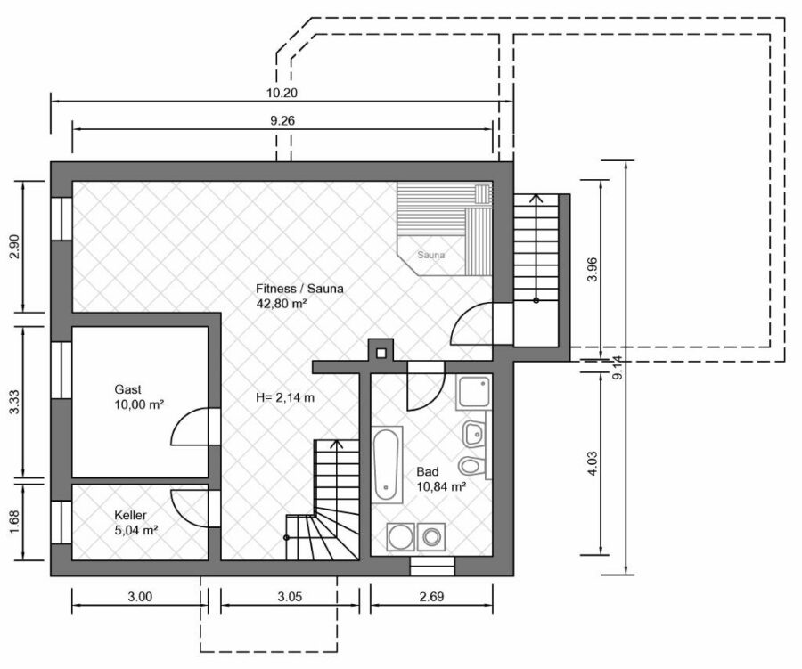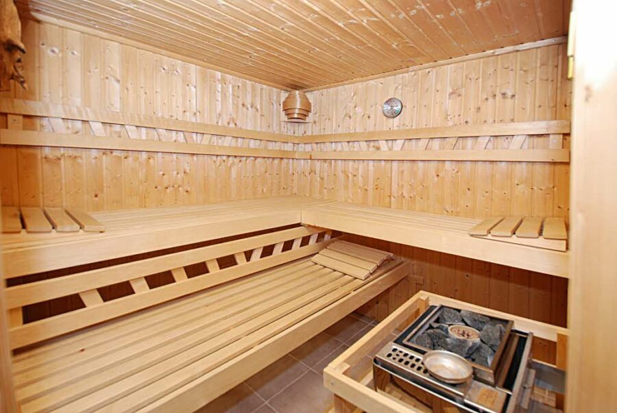 Im vollausgebauten Kellergeschoss finden Sie einen großen offenen Raum mit einer Sauna und Platz für Fitness, ein weiteres Bad mit Dusche, Wanne und Hauswirtschaft, ein Gästezimmer und einen Abstellraum. Der Keller ist beheizt. Hier ist auch ein Anschluss für einen zweiten Kaminofen vorhanden.