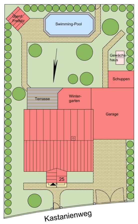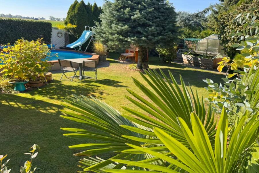 Vom Keller gelangt man über eine Treppe in die große Garage. Das Garagen-Rolltor und das Grundstücks-Tor lassen sich elektrisch öffnen. Ein weiteres Highlight ist der große Außenpool mit Kinder-Rutsche. Neben dem Pool laden eine Terrasse und ein Strandkorb zum Relaxen ein. Zusätzlich befinden sich auf dem Grundstück ein Gewächshaus und ein Holzschuppen.