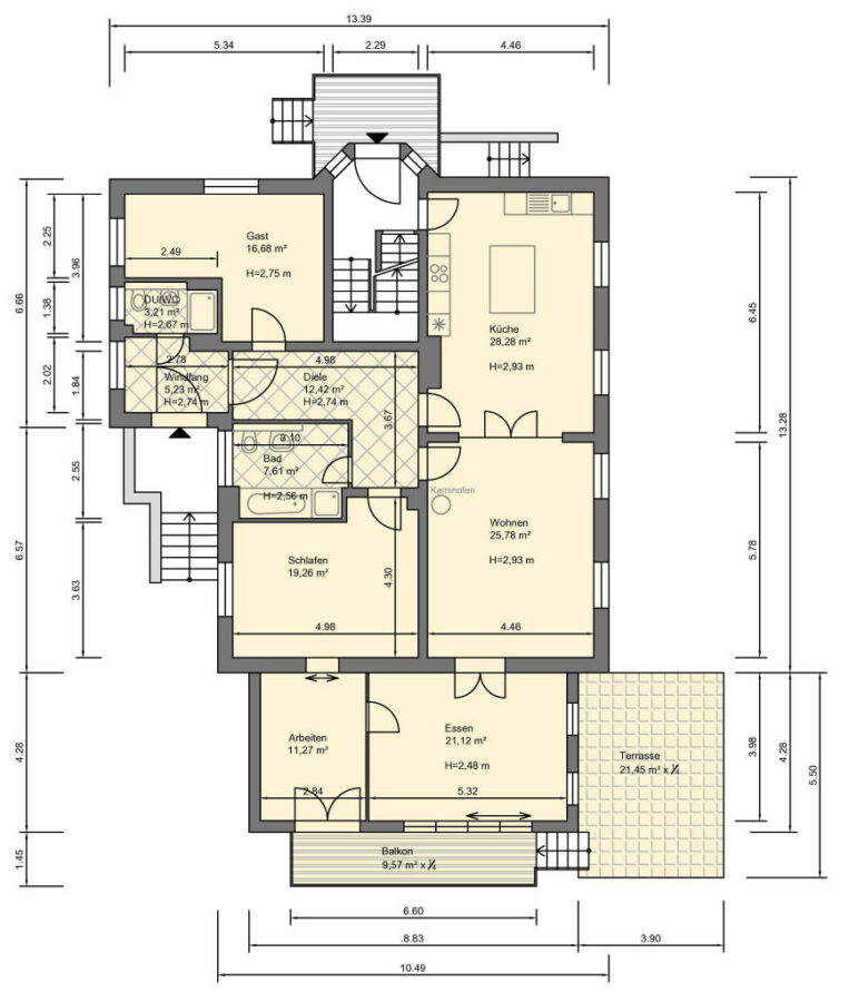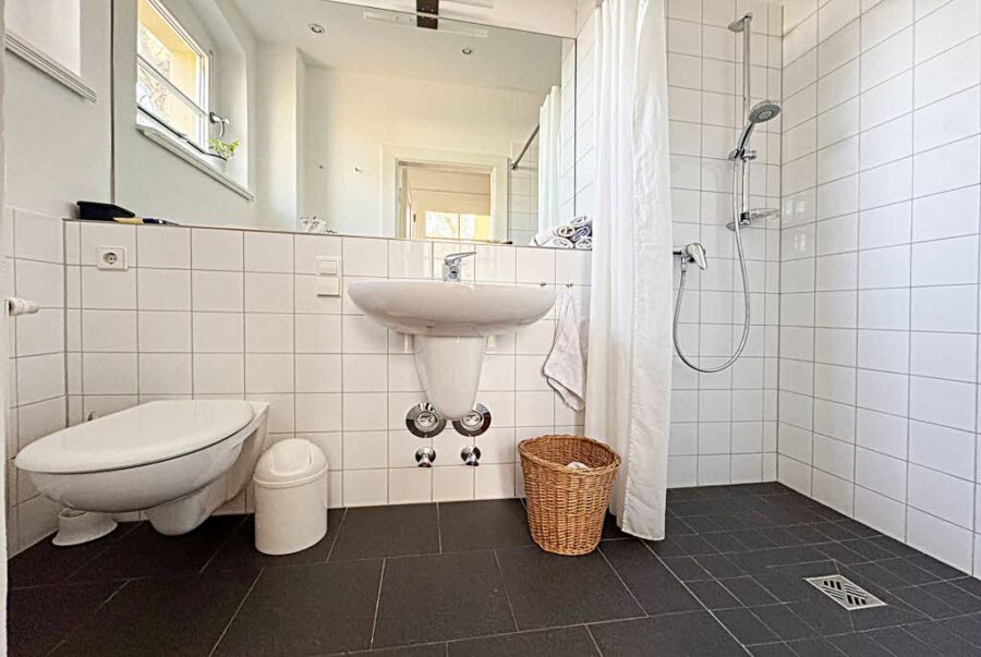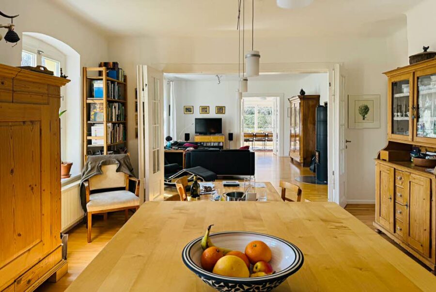 Die Wohnung liegt im Hochparterre und besitzt einen eigenen Eingang. Auf großzügigen 155 qm finden Sie 5 Zimmer, eine Wohnküche mit einer vom Schreiner angefertigten Einbauküche, ein Vollbad und ein Duschbad. Die modernen Duschen sind bodengleich. Der helle Essbereich hat bodentiefe Fenster, ähnlich einem Wintergarten. Hier liegen die Balkon- und die Gartenterrasse mit schönem Blick in den parkähnlichen eigenen Garten. Im Keller befinden sich 2 zugehörige Abstellräume mit ca. 32 qm Fläche.