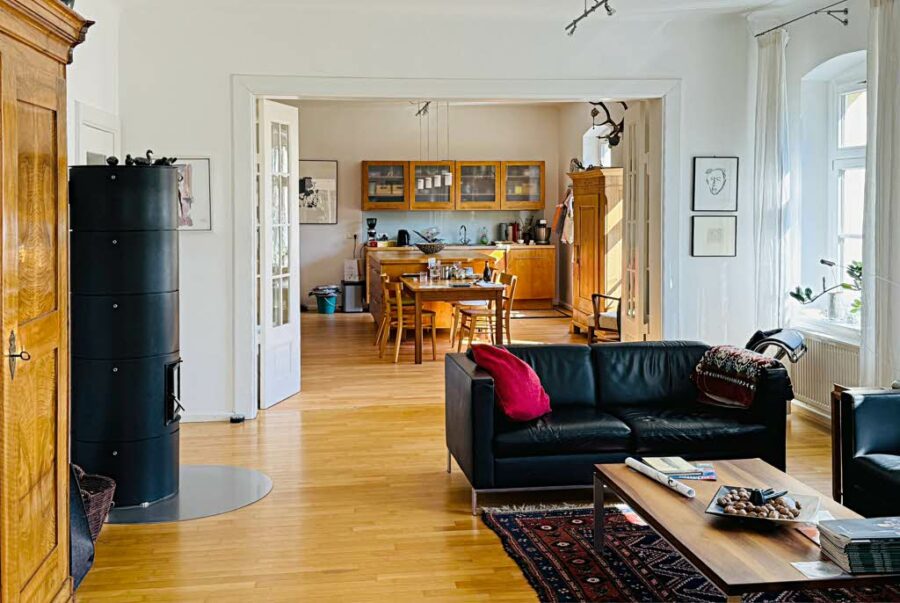 Die Fußböden sind mit Echtholzparkett belegt. Für zusätzliche Wärme sorgt ein moderner Rondolino-Kaminofen im Wohnzimmer.