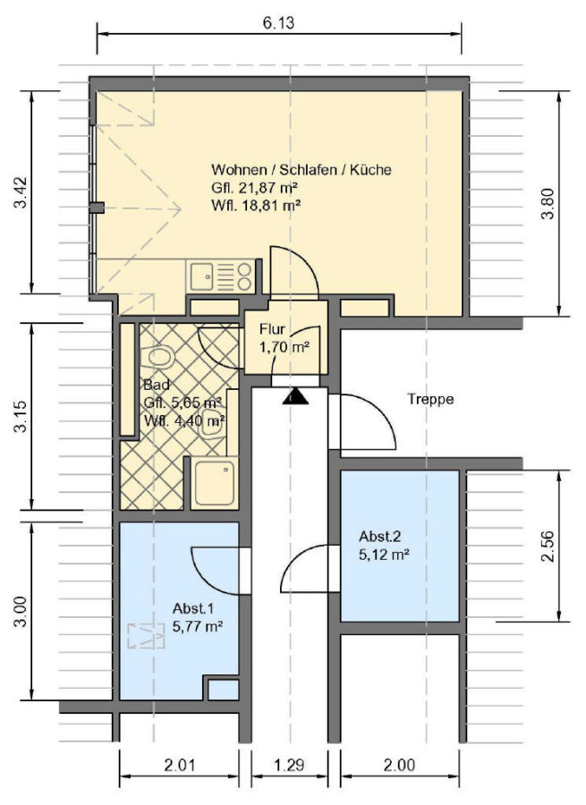 Auf ca. 25 qm Wohnfläche finden Sie ein großes helles Zimmer mit Single-Küche und ein innenliegendes Bad mit Dusche. Die Wohnung besitzt einen schönen Weitblick. Auf dem Flur befinden sich 2 Abstellräume, hier teilweise mit Fenster. Die Nutzung ist geeignet für Hobby, Abstellen oder sogar als Arbeitszimmer.